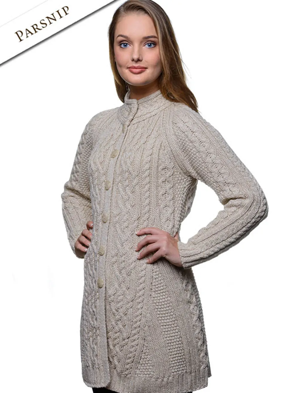 This Merino Wool Coat is a classic take on the original coat style with an Aran twist. Tightly knit with original cable stitching, it is specially crafted to keep out the Winter chills with its botton up design and high neck collar.