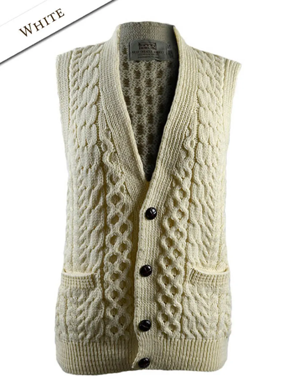 Our traditional Aran Waistcoat with leather-look buttons is one of our most original styles. Always in fashion due to its timeless design, this Aran waistcoat is best worn with a polo in Winter or over a shirt or blouse in the milder seasons.