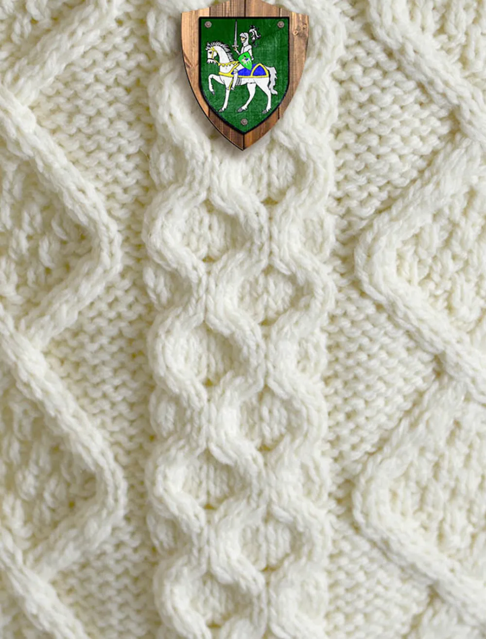 This beautiful MaguireClan Aran Throw (measuring 64″ by 40″) has been produced in the traditional báinín (pronounced ‘baw neen’) colour, the natural white of the wool. It comes to you complete with a clan history and crest.