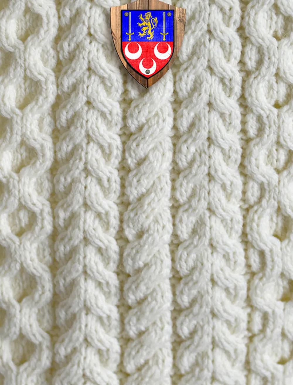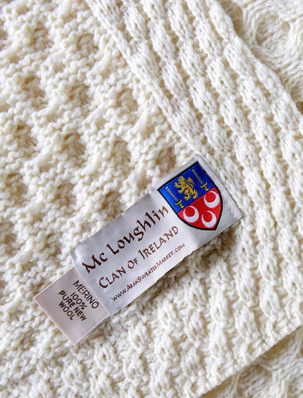 This beautiful Mc LoughlinClan Aran Throw (measuring 64″ by 40″) has been produced in the traditional báinín (pronounced ‘baw neen’) colour, the natural white of the wool. It comes to you complete with a clan history and crest.