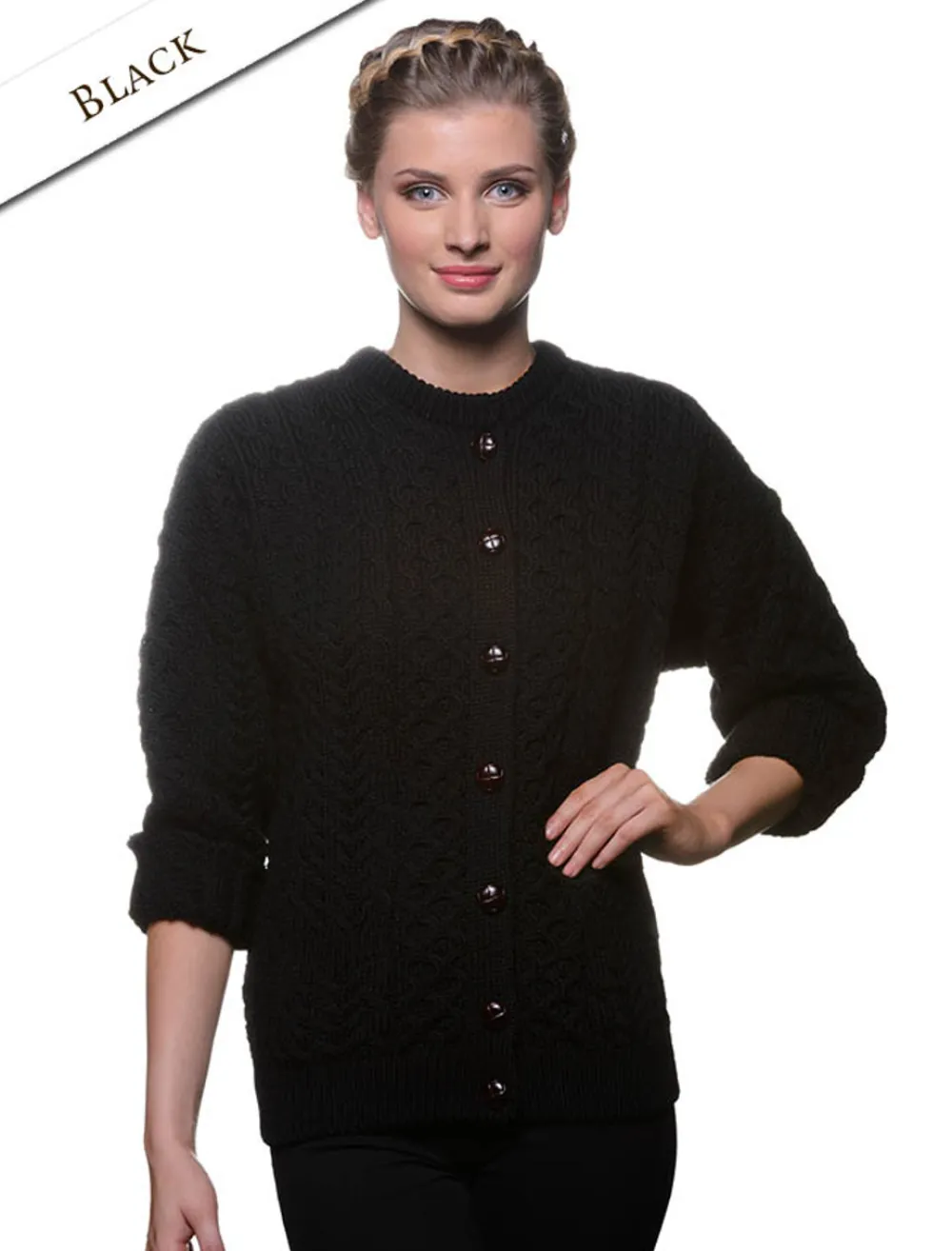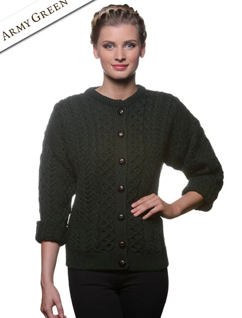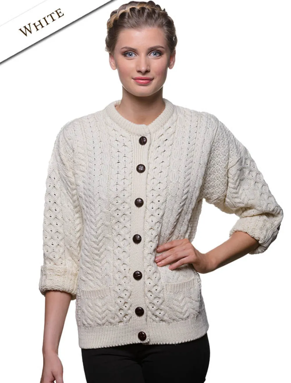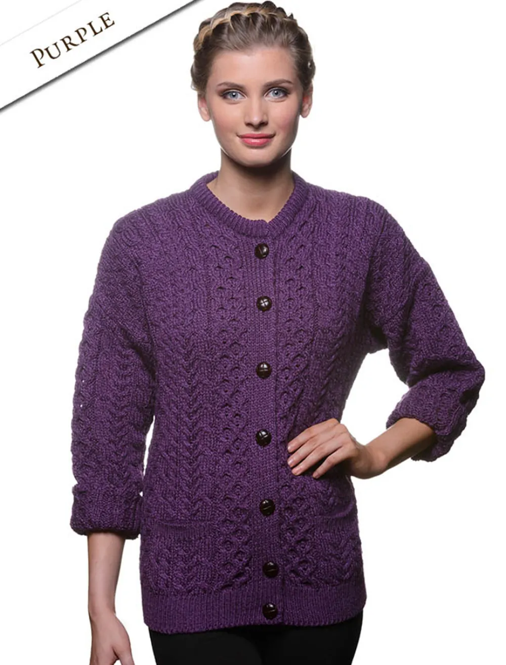 Ourtraditional Irish Aran Cardigan for women is made from 100% Merino Wool. This is a timeless and elegant classic featuring the ancient honeycomb stitch throughout. This high quality Cardigan is available in an array of coloursfromsize XS to XXL.