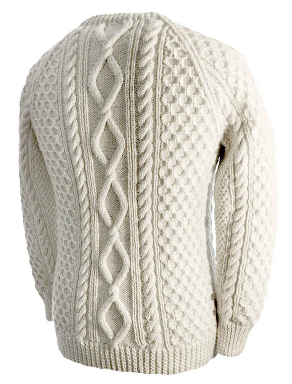 This beautiful Aran sweater has been hand knitted in the traditional báinín (pronounced ‘baw neen’) colour, the natural white of the wool. It comes to you complete with a clan history and crest. It is made of 100% pure new wool, is water repellent and breathable. It has been hand crafted in the traditional Irish style, and, with care, will last a lifetime.