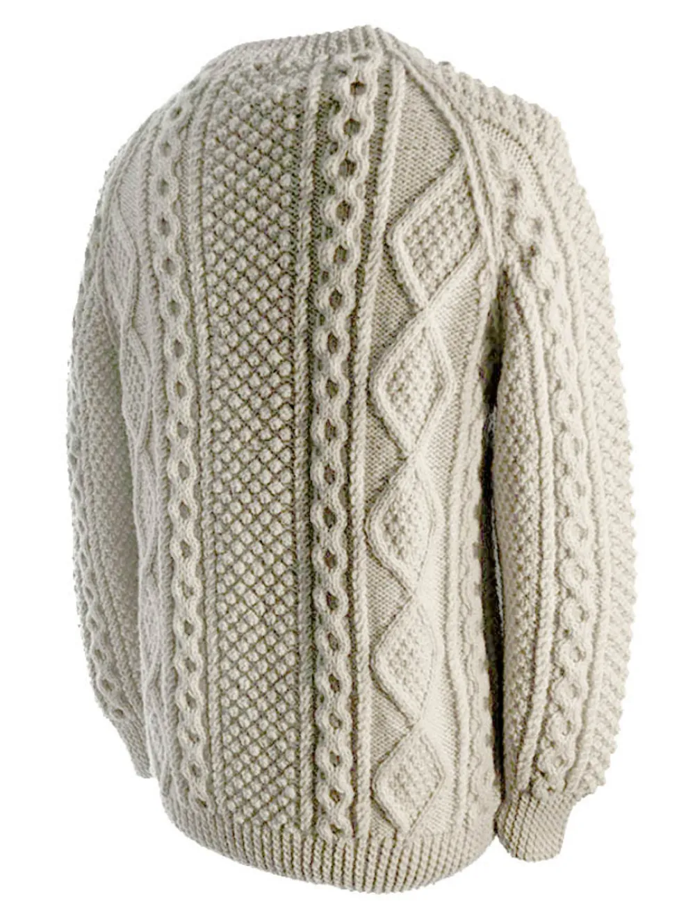 The handknit McCarthy Clan sweater has a blackberry centre stitch panel, it is flanked by 1 single row of honeycomb and outside of this vertical rows of moss filled diamonds. The blackberry stitch represents the holy trinity, honeycomb for work (the industriousness of the bees) and the diamonds are a wish for wealth. This beautiful Aran sweater has been hand knitted in the traditional báinín (pronounced ‘baw neen’) colour, the natural white of the wool. It comes to you complete with a clan history and crest. It is made of 100% merino wool, is water repellent and breathable. It has been hand crafted in the traditional Irish style, and, with care, will last a lifetime.