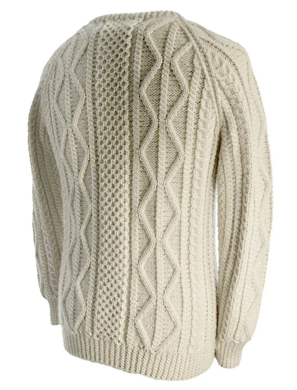 The hand knit O’ Keeffe sweater has a central honeycomb panel flanked by cables and diamonds. The honeycomb pattern represents work- the industriousness of the bees. The cable stitch symbolises luck and the diamonds represent a wish for wealth. This beautiful Aran sweater has been hand knitted in the traditional báinín (pronounced ‘baw neen’) colour, the natural white of the wool. It comes to you complete with a clan history and crest. It is made of 100% pure new wool, is water repellent and breathable. It has been hand crafted in the traditional Irish style, and, with care, will last a lifetime.