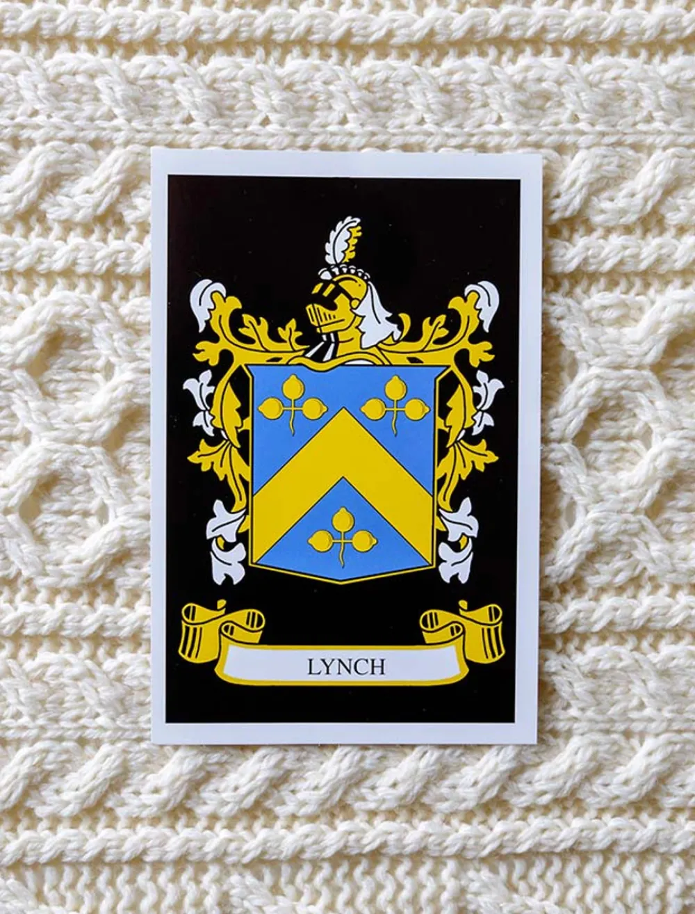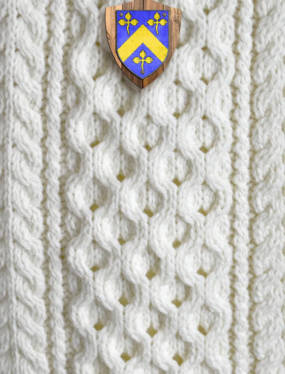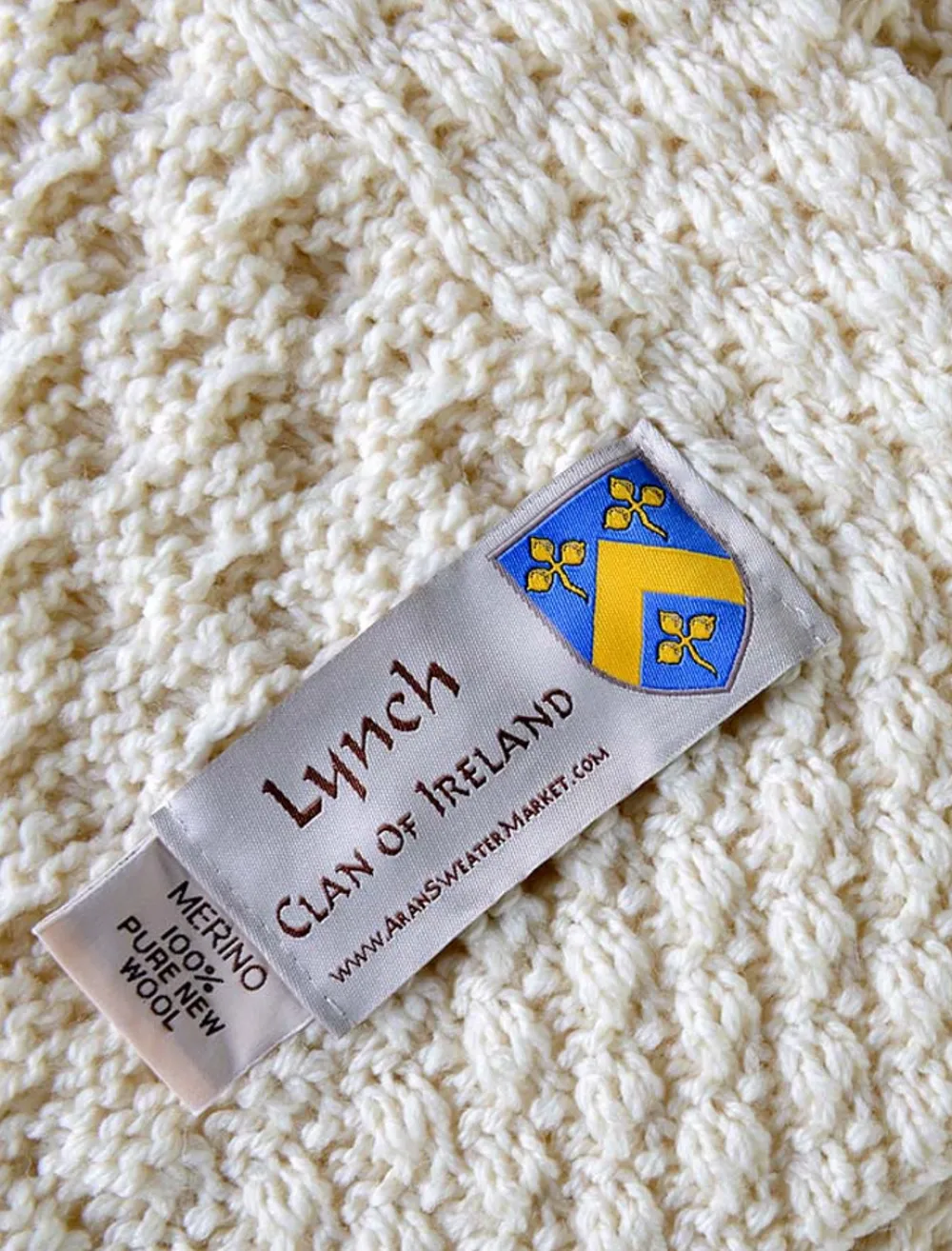 This beautiful LynchClan Aran Throw (measuring 64″ by 40″) has been produced in the traditional báinín (pronounced ‘baw neen’) colour, the natural white of the wool. It comes to you complete with a clan history and crest.