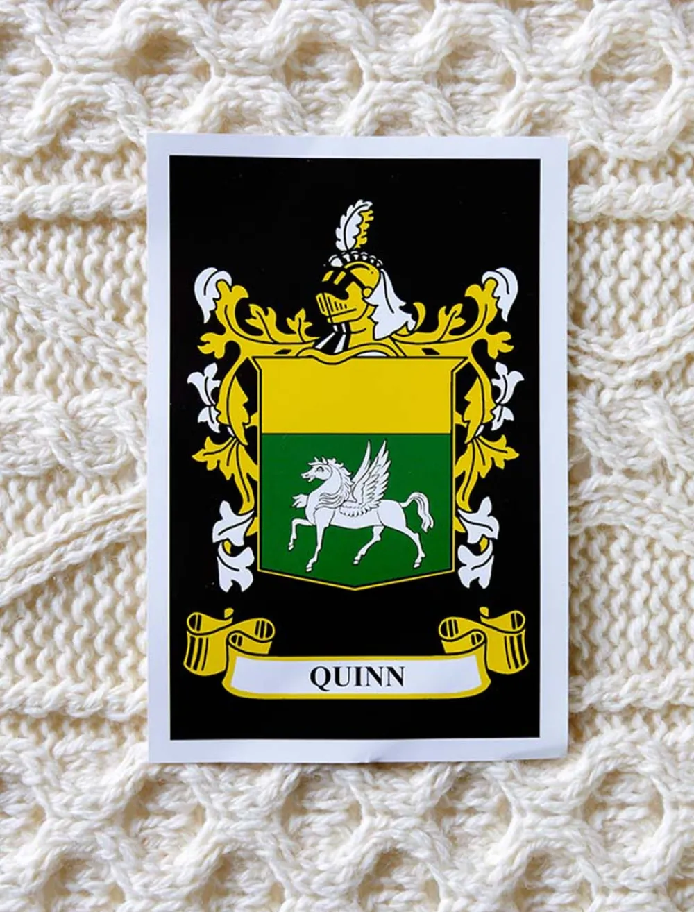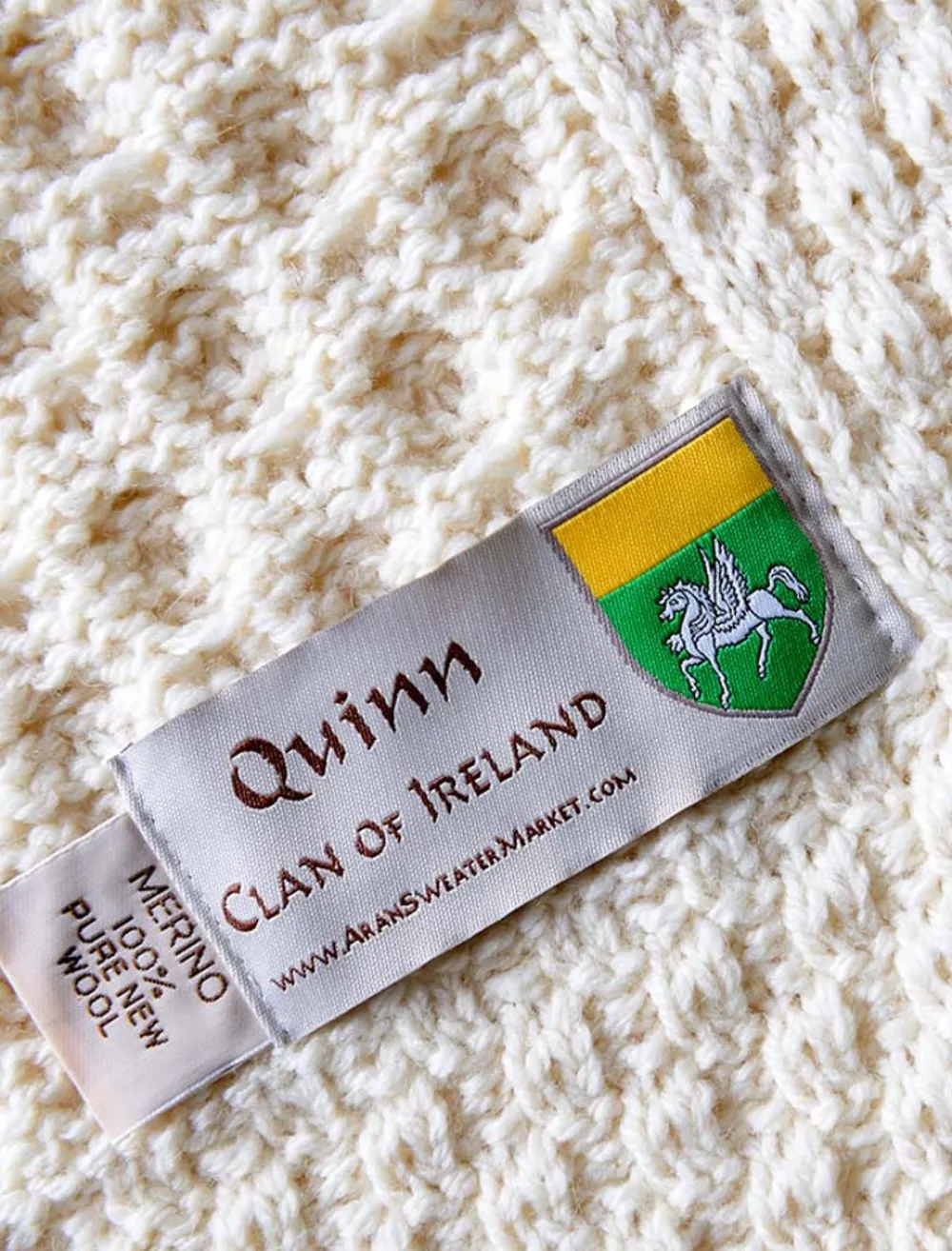 This beautiful QuinnClan Aran Throw (measuring 64″ by 40″) has been produced in the traditional báinín (pronounced ‘baw neen’) colour, the natural white of the wool. It comes to you complete with a clan history and crest.