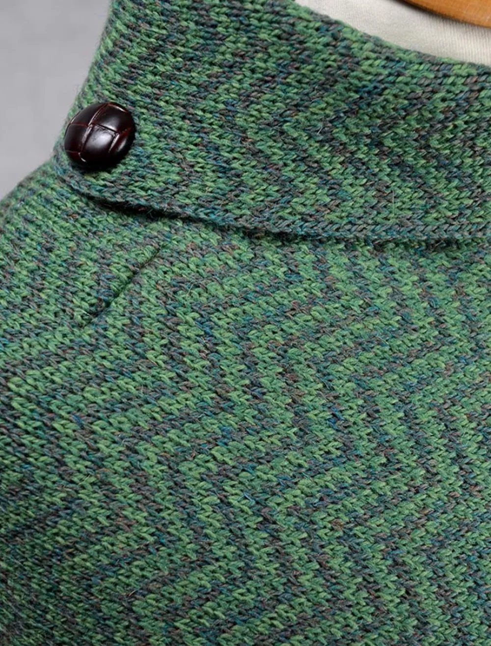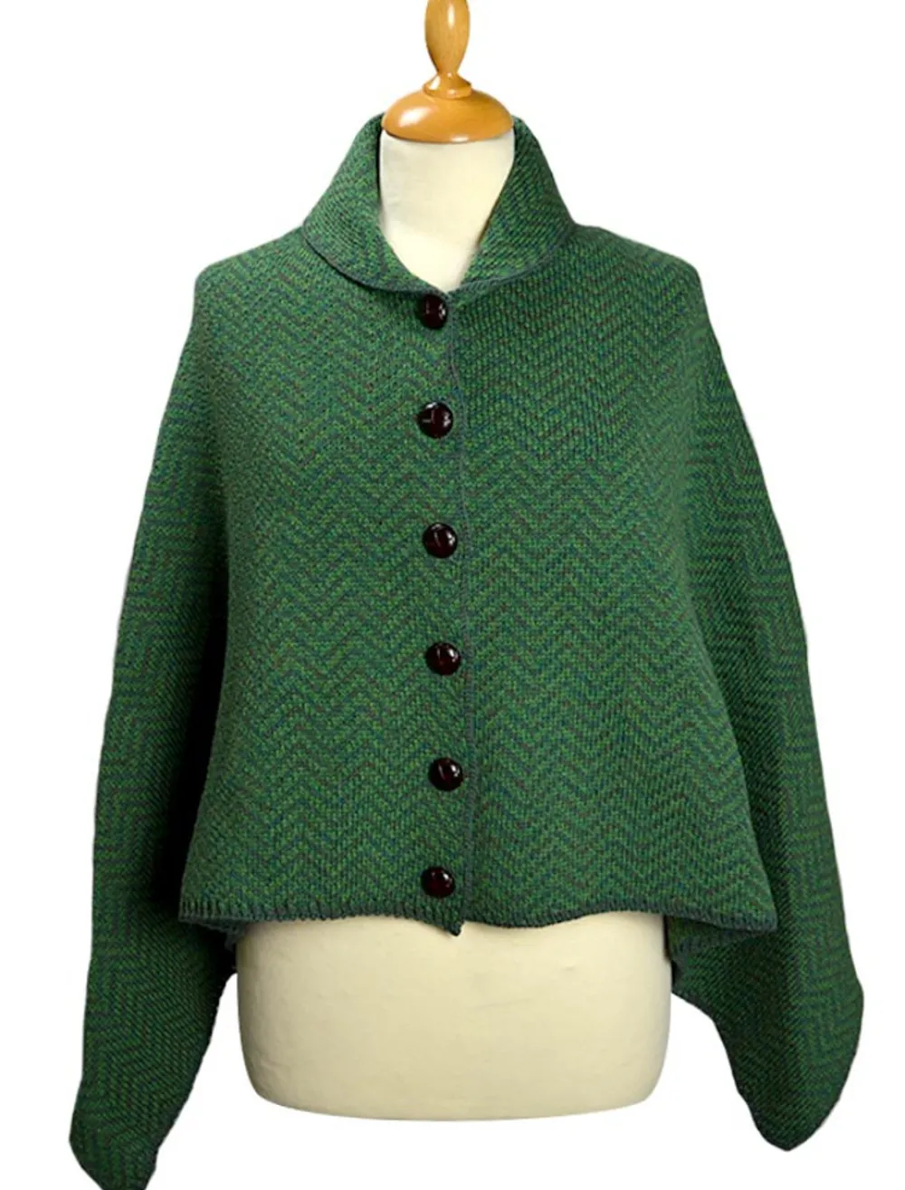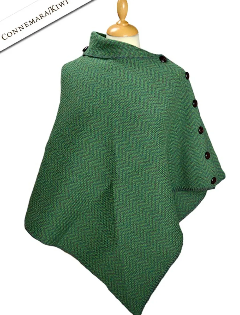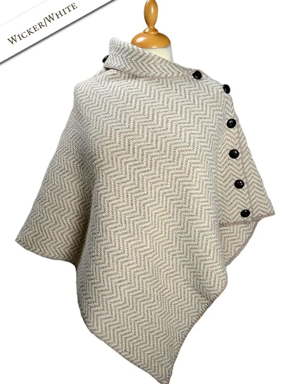 Our Herringbone Merino Poncho with Button Detailis a modern take on classic Irish design. This garment, while featuring a herringbone pattern in complimentary color, is the ideal companion for any woman as it is comfortable, practical and flattering for all body shapes.